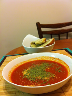 Above the tomato soup is sprinkled with pepper, cilantro, and parmesean cheese, I usually buy bread from the Greek Resto Estia and cut it into slices, freeze and pop it into the toaster for times like these 🙂 super yum