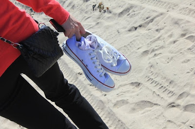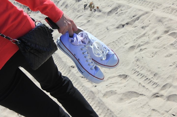 I bought these shoes at a Converse outlet store in Las Vegas for a fraction of the price of what they are sold in Canada. I remember being in the store (which was packed with people) and there were two small children being fitted for chucks: green and pink. They both sat patiently with smiles on their faces while the sales associate laced them up; it was adorable, and neat that shoes can be enjoyed by both children and adults alike.The photo above was taken when I was in California walking along New Port Beach. Ah… to have my feet in the sand again.