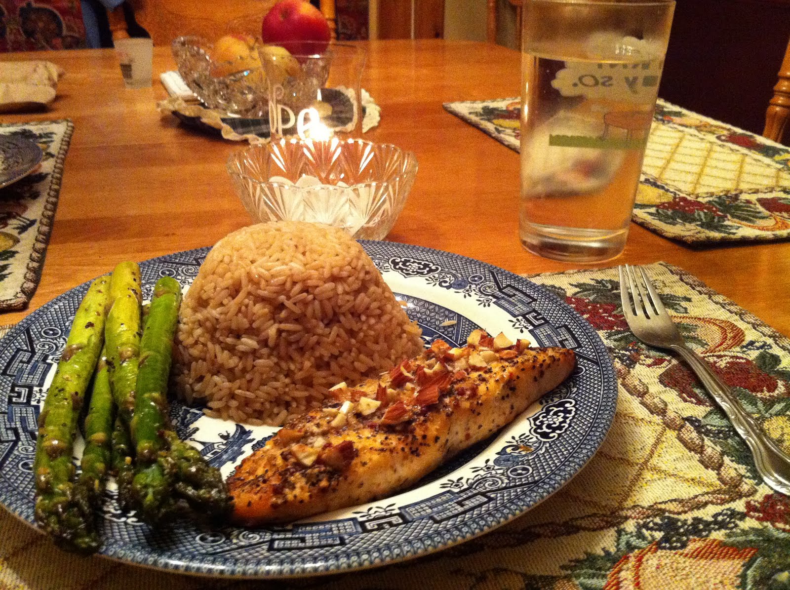 To cook salmon in oven bake at 350 degrees for 20 minutes +/- depending on the size of the salmon and your oven. If the center of your salmon had turned from dark pink to light, you should be good to go. Super yum almond crusted salmon with grilled asparagus with a side of rice: easy peesy right?