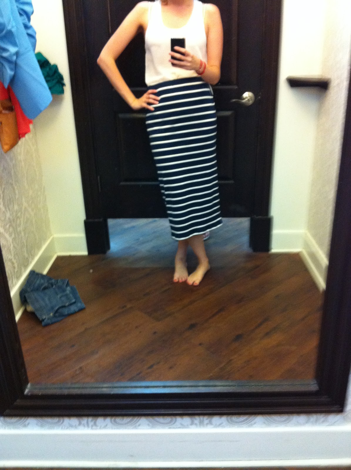 Initially I wasn’t sure about the skirt, I could hear Stacy London in my head screaming “YOU DON”T WEAR HORIZONTAL STRIPES ACROSS YOUR MIDDLE!”. Since I had like 20 minutes to spare for shopping, I was shopping alone, and so I didn’t even have an honest friend to be like “OH No No No!!” I asked the sales associate, she has the coolest bangs, so I totally trusted her fashion sense, and bought the skirt.