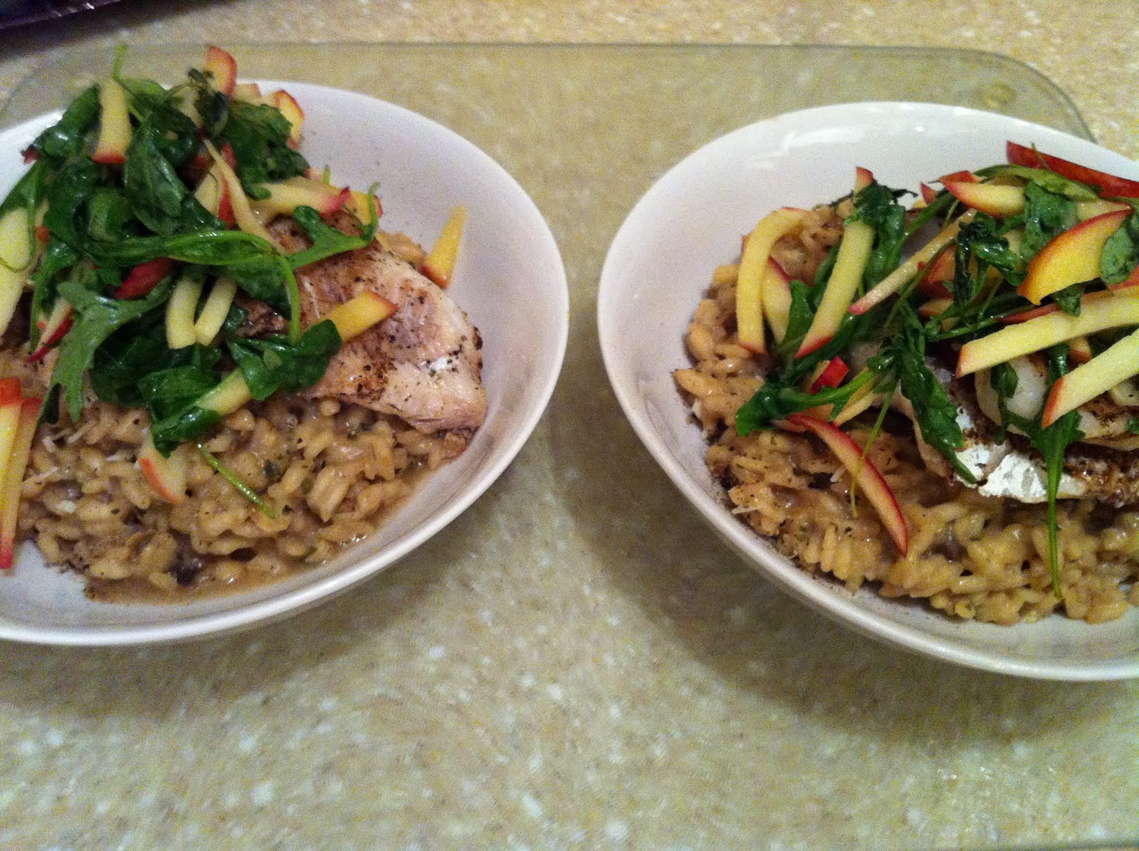Start assembling your dish by putting the risotto on the bottom, and then adding your fish. Finally top both with the apple arugula mixture, and voila c’est tout.