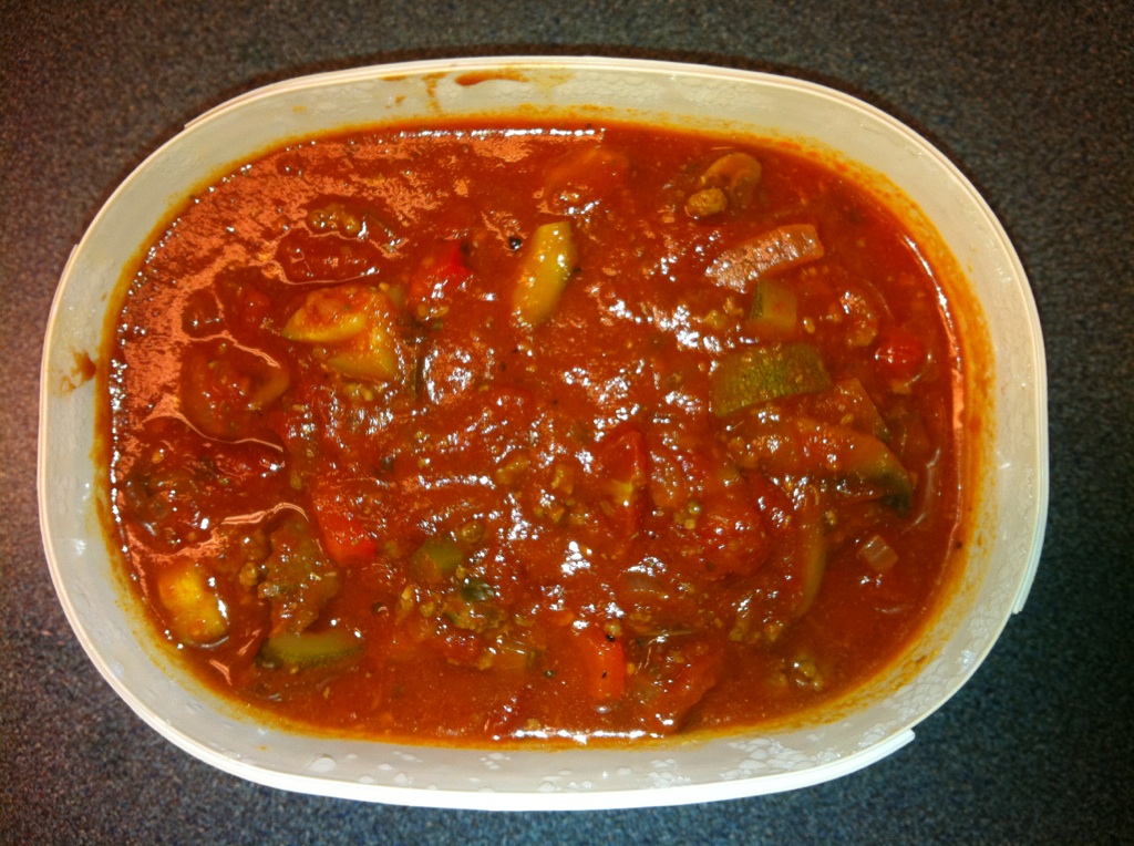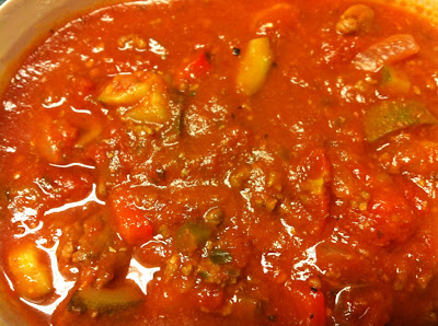 Fall must be coming… when I looked at the local zucchini I got at the grocery store, I didn’t think “mmm, grilled with balsamic vinegar” but “mmm…pasta sauce to eat now and freeze for later”. With school starting, a busy job, and a husband who works shifts, plus all the after school activities for the kids, it’s nice to have something homemade from the freezer to pull out for a quick dinner. When I make things like pasta sauce, I always make a big batch – enough for a few meals, frozen in dinner-sized amounts. If you’re going to do the work, you might as well get the most out of it! This applies to chili, soups, and stews too…go big or go home, or rather, homemade!