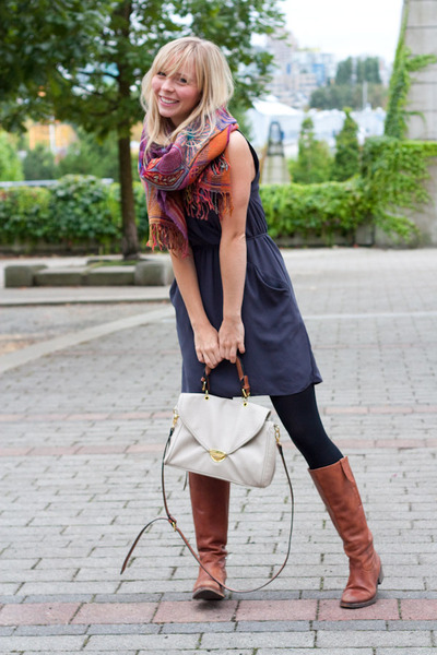 Love this causal day time look with pairing ridding boots with simple black tights, and a jersey dress. This over-sized printed scarf is perfection with the similar color detail that is picked up in the boots; she keeps it simple everywhere else to balance. Well done.
