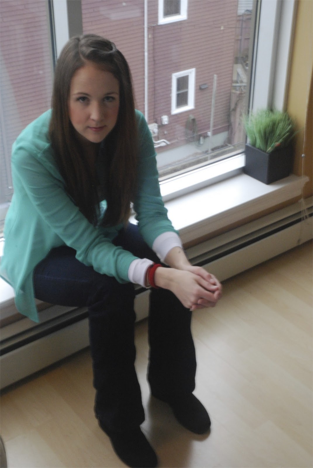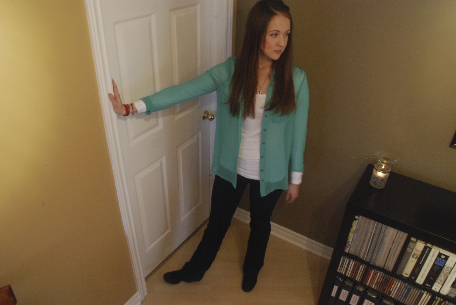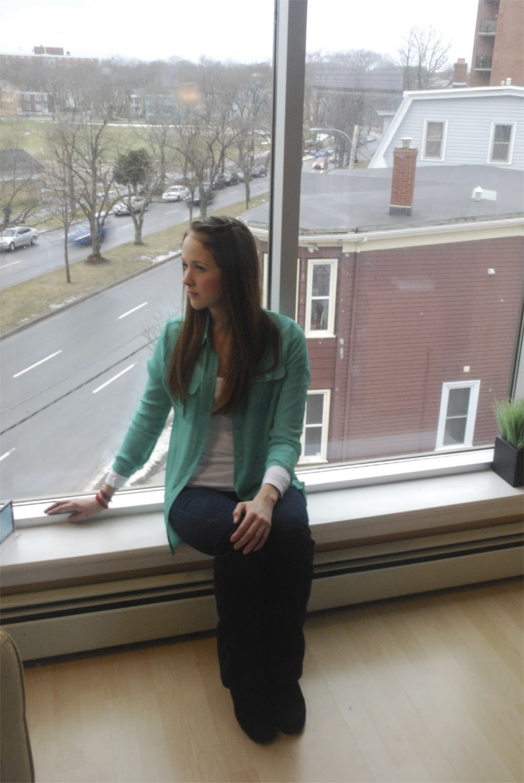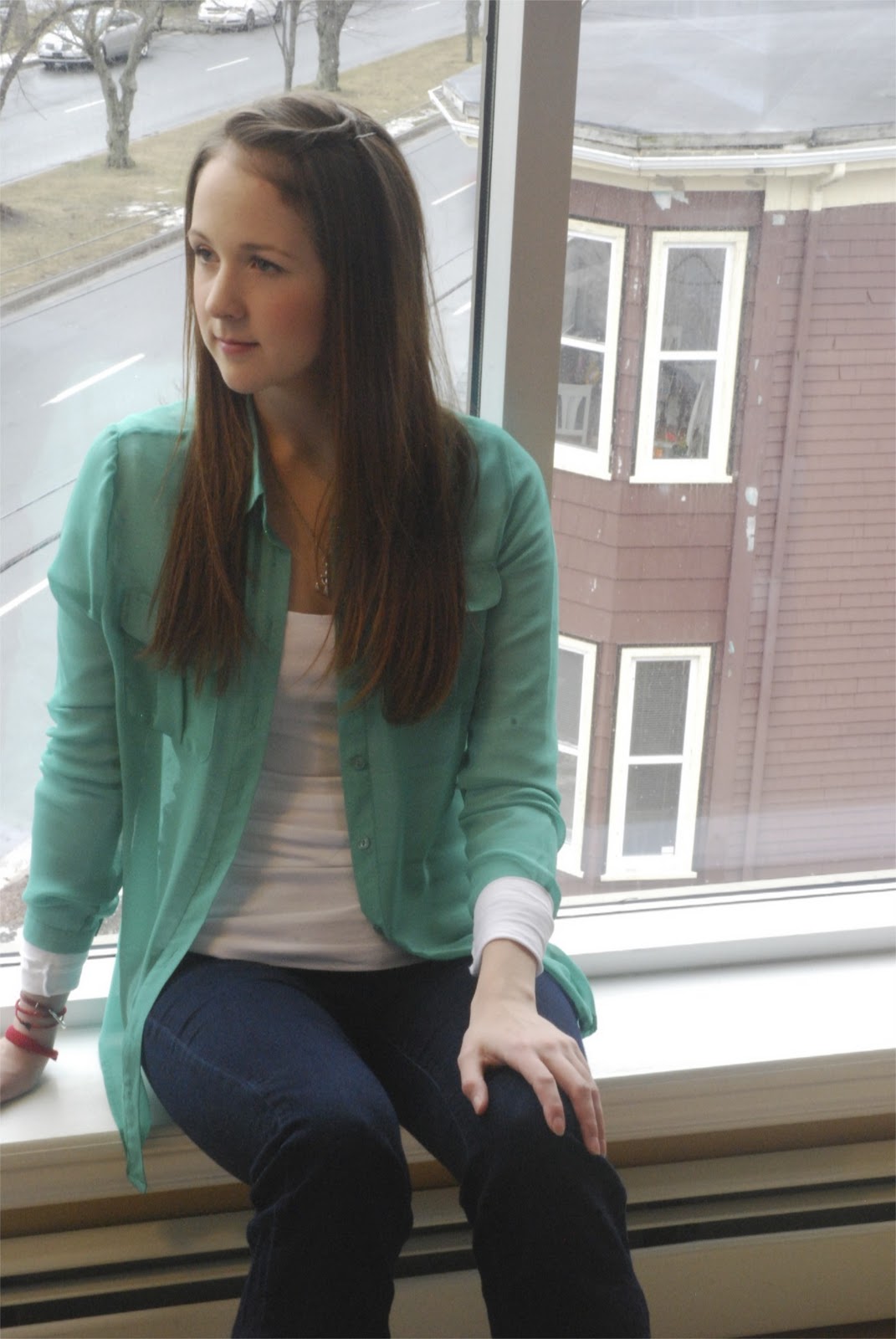 I chose this sea foam green colour blouse, and paired it with a white long sleeve t-shirt and dark denims and boots. But this blouse could easily be tucked into some trousers, or a skirt with tights, or paired with some lovely prints. For Spring this blouse would look amazing colour blocked with a hot pink skirt or skinny jeans. You could also fire this puppy underneath a sweater, although you would be doing a disservice to this beautiful colour by covering it up. On second thought maybe just do a cardigan.