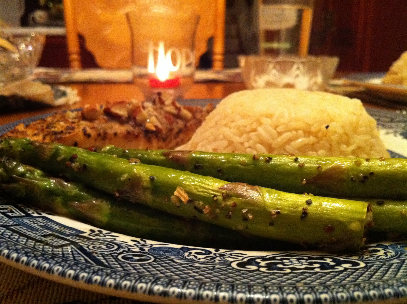Toss your cut, peeled, or snapped asparagus in olive oil, and place on a baking sheet. Sprinkle with salt and pepper, and bake on 350 degrees for about ten minutes. Be careful not to overcook them, they turn into rubber pretty quick: YUCK!