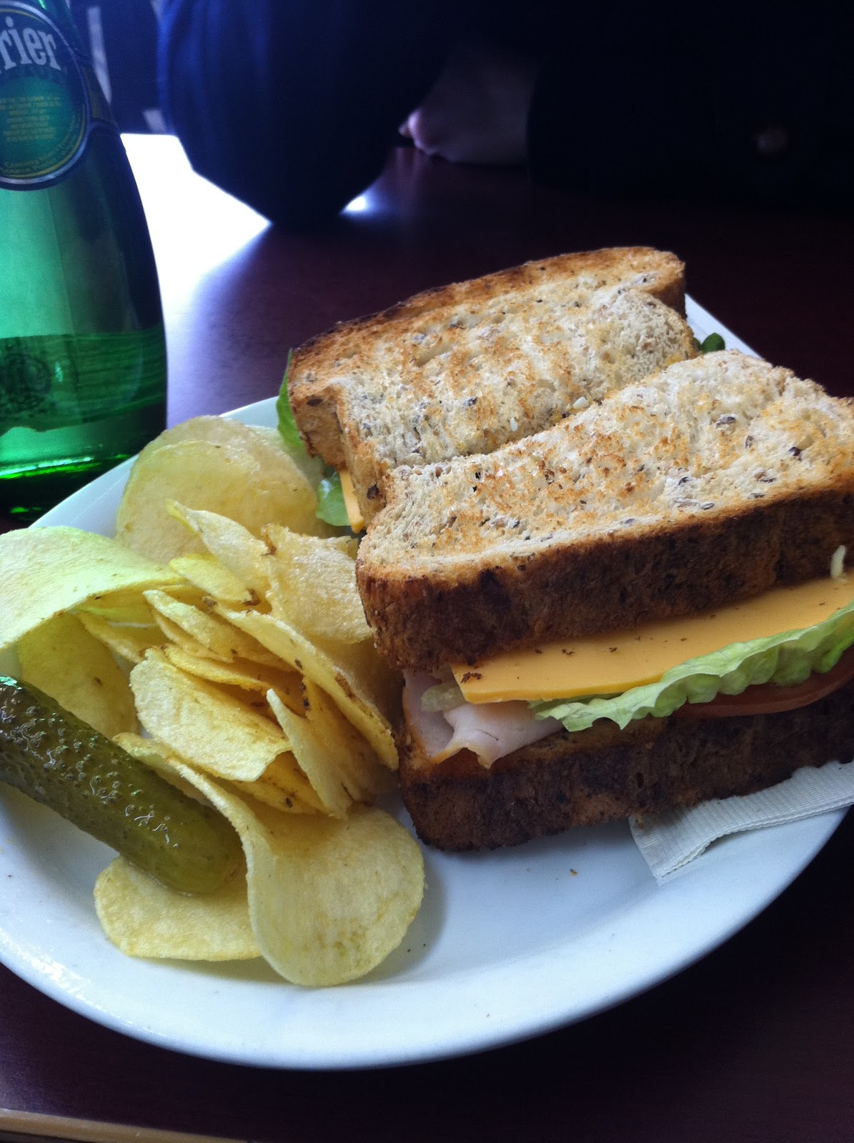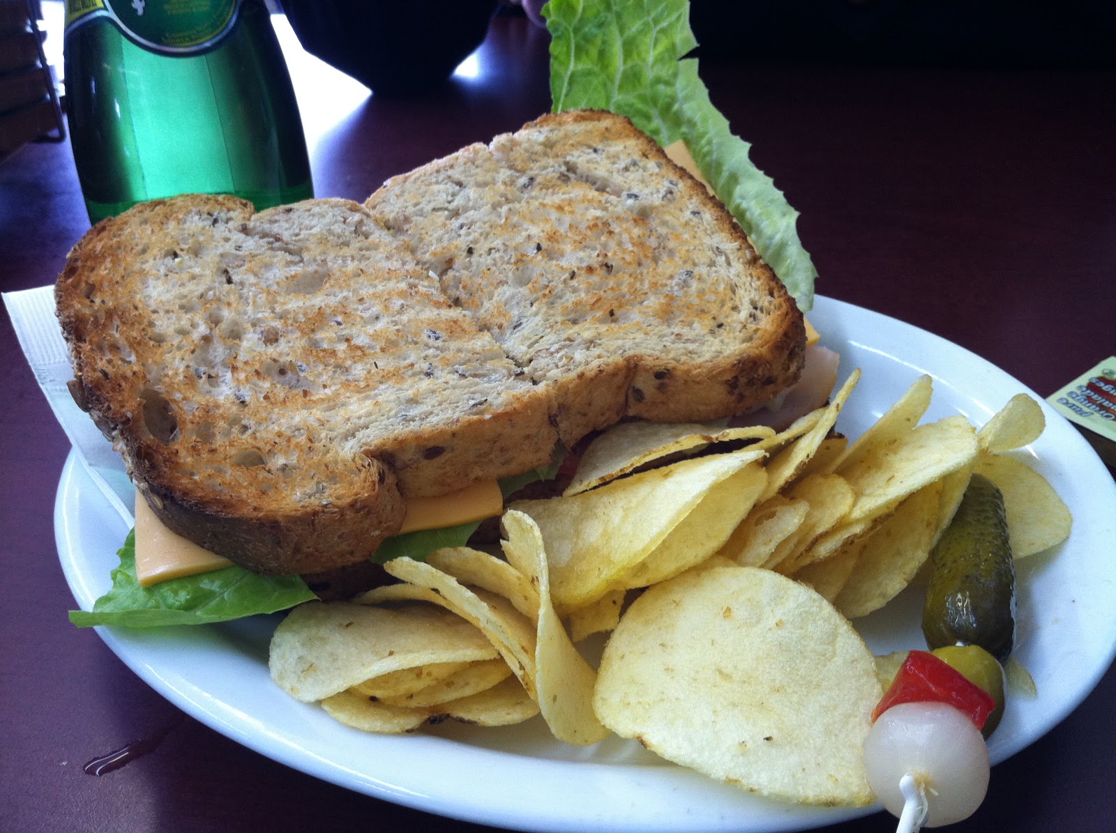 The sandwich above is their toasted Smoked Turkey and Tomato, I subbed in cheese and lettuce in place of the bacon, and held the mayo. The sandwich is rather large and probably could be shared between two people. It is a hearty meal, potato chips come on the side, along with a little pickled olive.